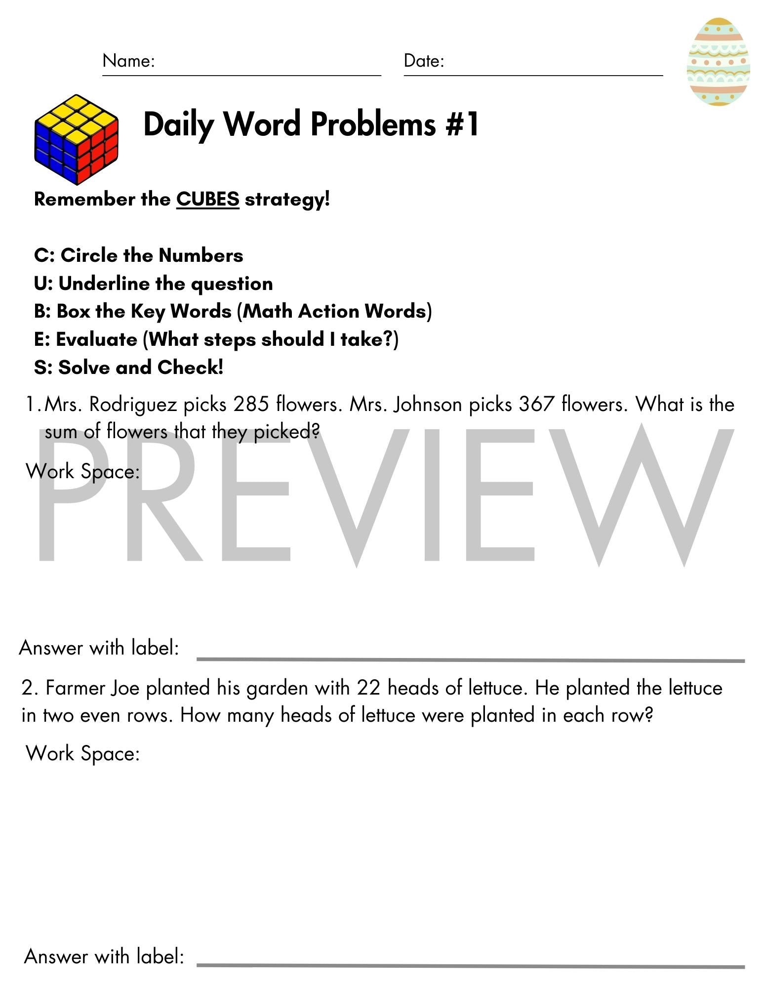 This product includes daily math word problems for the month of April that give students the opportunity to apply their learning in real world math situations. These April word problem activities also include the CUBES strategy and scaffolds built within the pages for students who may have difficulties with breaking down word problems and identifying the correct operation to use. The concepts included in these word problems are two, three, and four digit addition and subtraction, multi-step word problems, elapsed time, multiplication, division, multiplying by a digit of 10, counting money, and making change. These include themes of Easter, Opening Day for baseball season, and the beginning of spring.