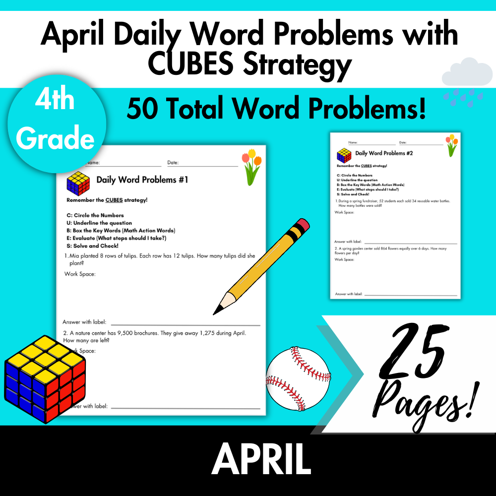 This product includes daily math word problems for the month of April that give students the opportunity to apply their learning in real world math situations. These April word problem activities also include the CUBES strategy and scaffolds built within the pages. The concepts included in these word problems are multi-digit addition and subtraction with regrouping, multiplication, division, multi-digit multiplication, area and perimeter, making change, and multi-step word problems. This set includes spring and holiday themed problems including baseball, Easter themed problems.