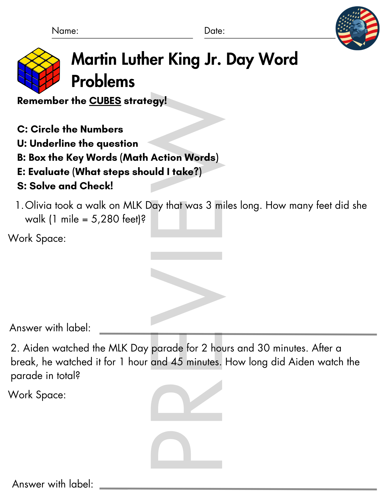 Martin Luther King Jr. Day Word Problems with CUBES Strategy | 4th Grade