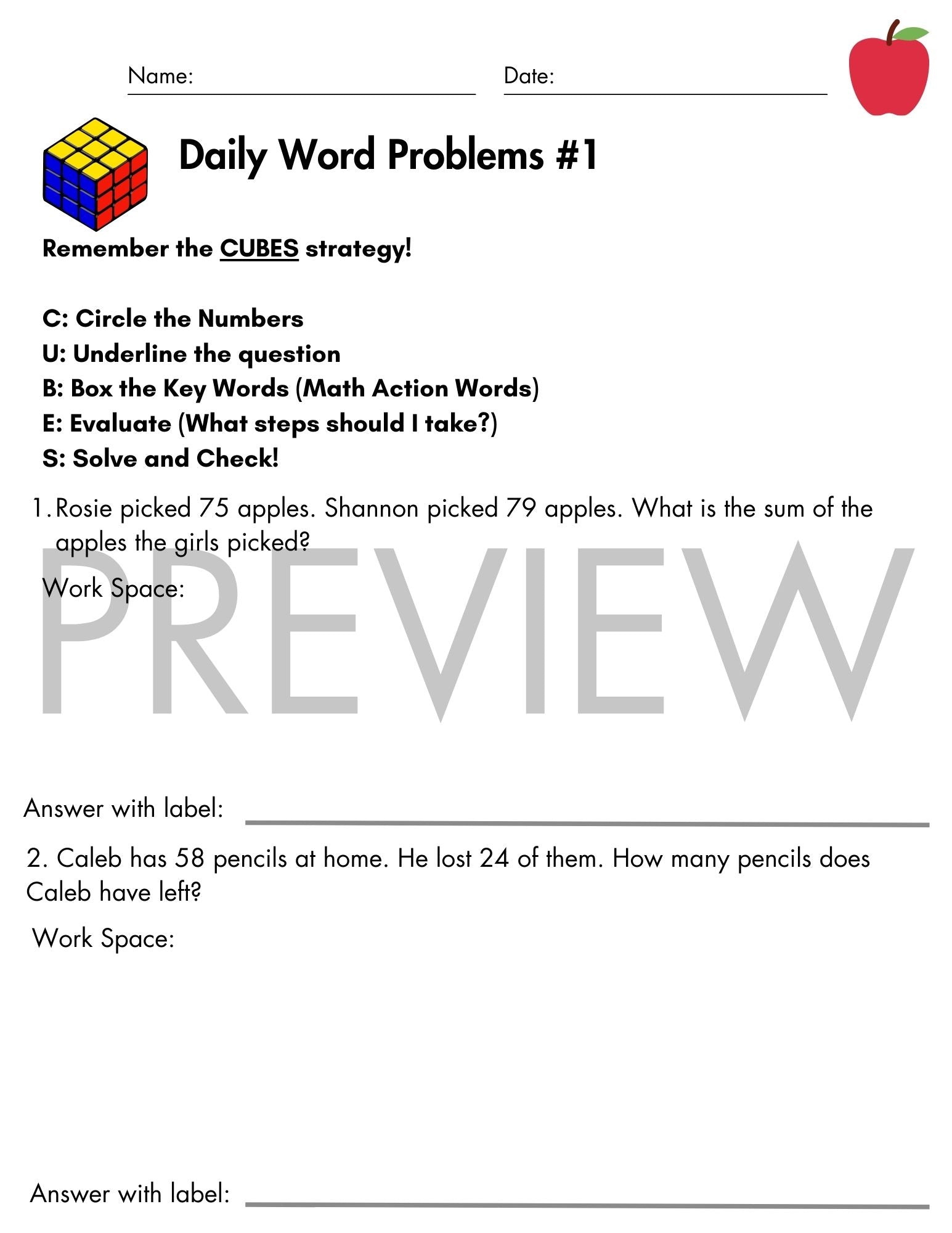 This product includes daily math word problems for the month of September that give students the opportunity to apply their learning in real world math situations. These September word problem activities also include the CUBES strategy and scaffolds built within the pages. These are mostly used for third graders but could also be used for second or fourth graders or students struggling with word problems. The concepts included in these word problems are two, three, and four digit addition and subtraction (some with regrouping and some without).