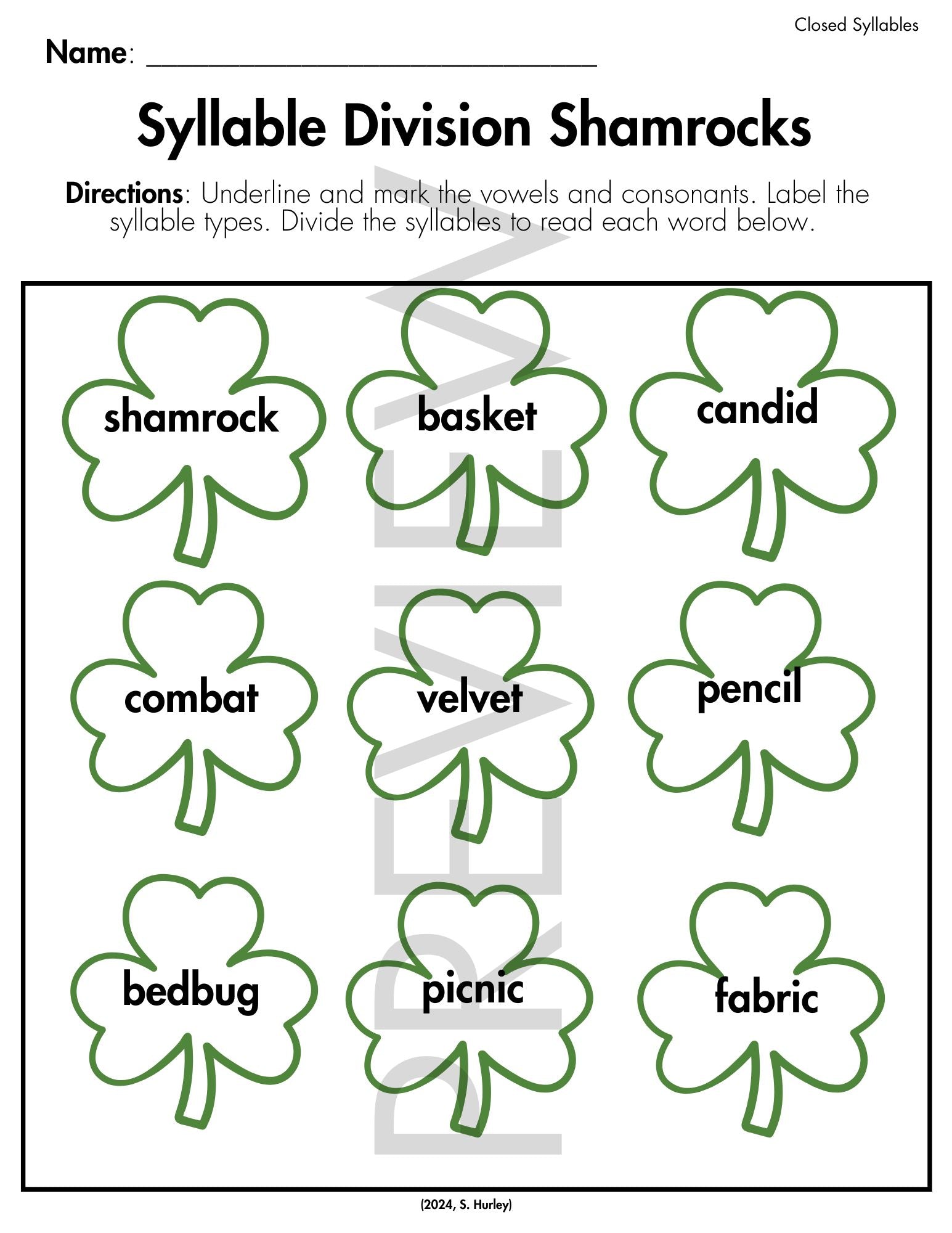 This product includes 15 pages of syllable division shamrocks to go along with the teaching of syllable division types. The activities require students to underline the consonants and vowels, label the syllable type, and divide and read the multisyllabic words. Concepts included on the hearts are open and closed syllables, beginning and ending blends, vowel-consonant e, vowel teams (ee, ea, ai, ay, oa, oe), r-controlled vowels, and consonant -le. This is a perfect phonics activity to use in March or for St. Patrick's Day!